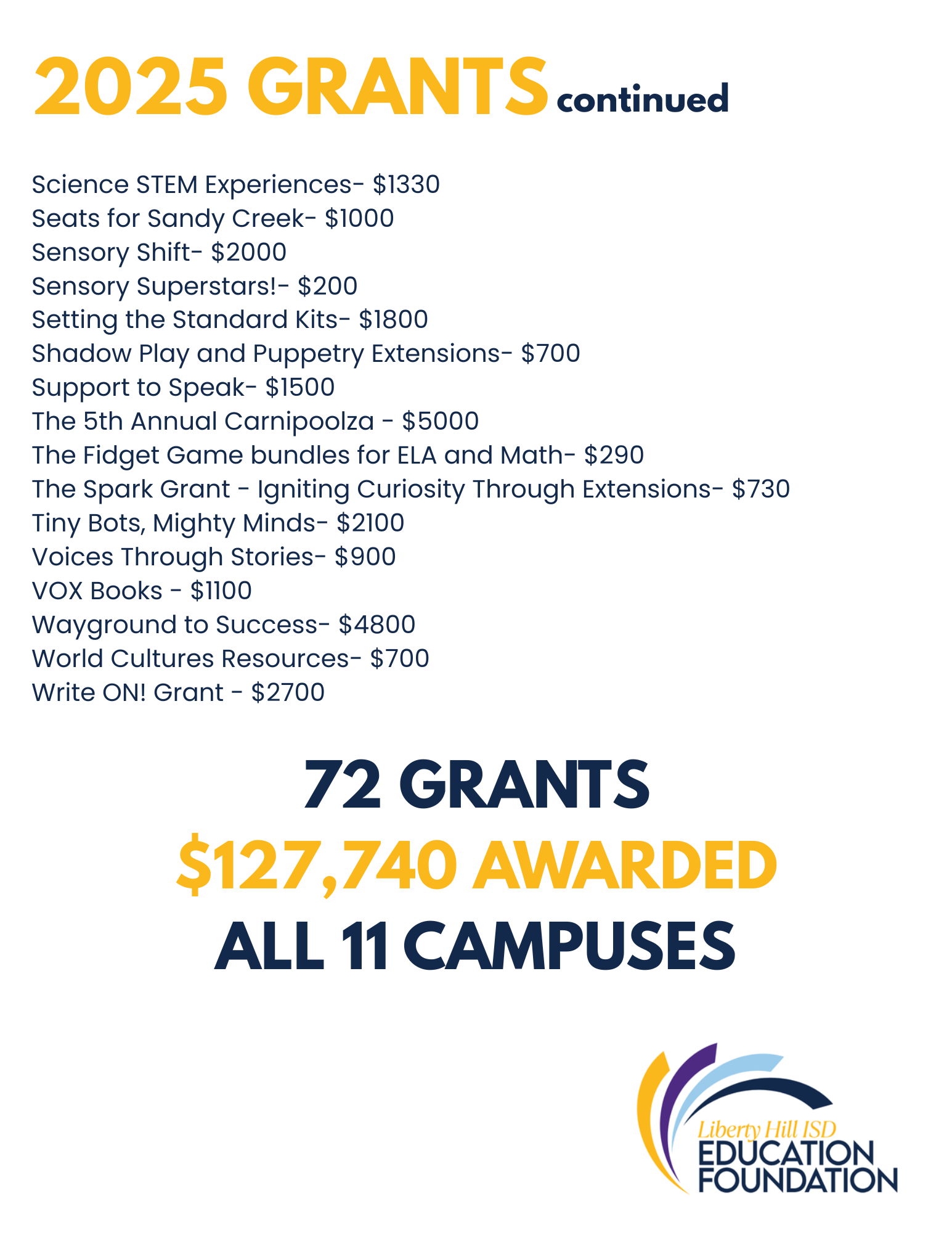 The Liberty Hill ISD Education Foundation Grant Program provides funding to LHISD teachers and staff to bridge the gap between district resources and academic needs, helping to foster an enhanced educational experience for students.
